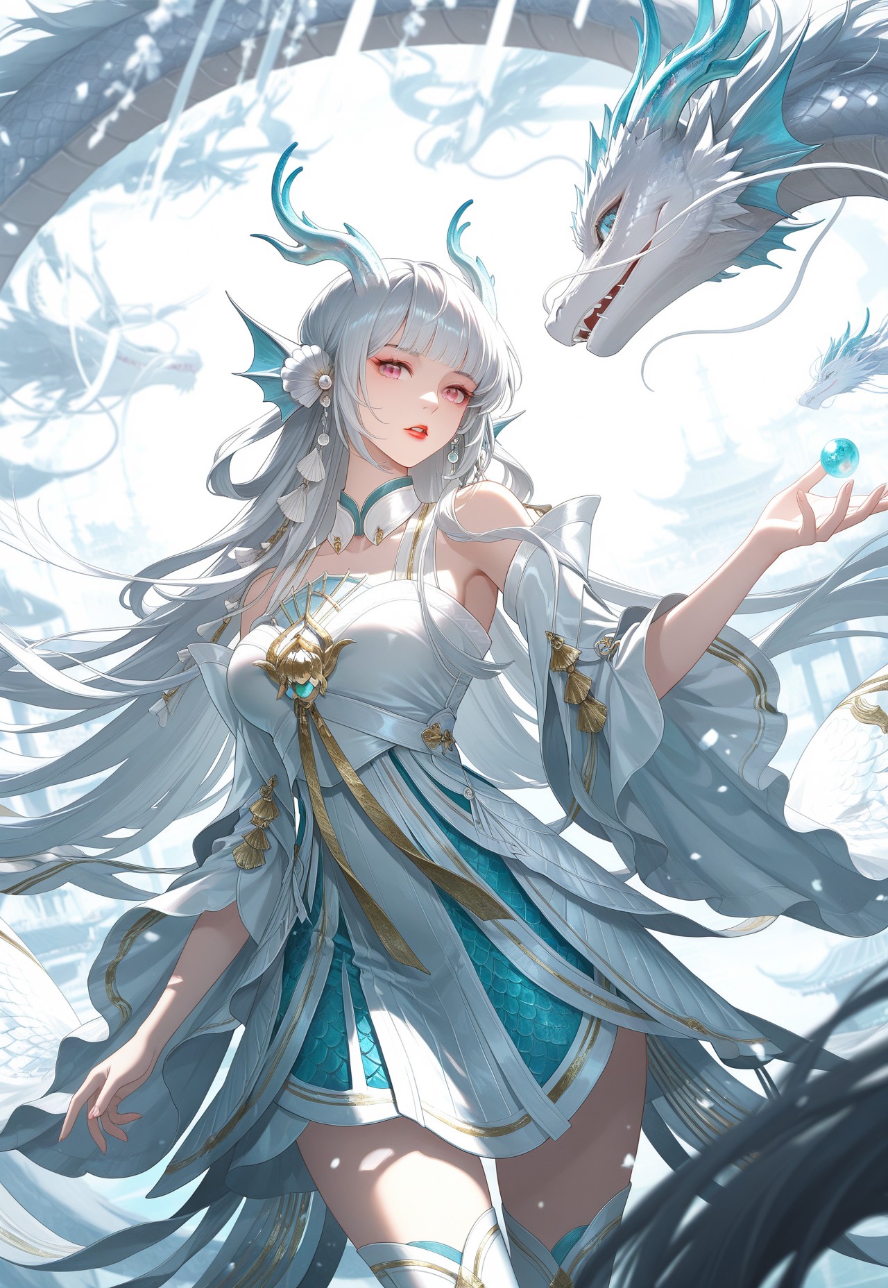 HOKshixi, long hair, white hair, dragon horn, hair ornament, pink eyes, lipstick, earrings, jewelry, detachable sleeves, multicolored dress, thighhighs, dragon,