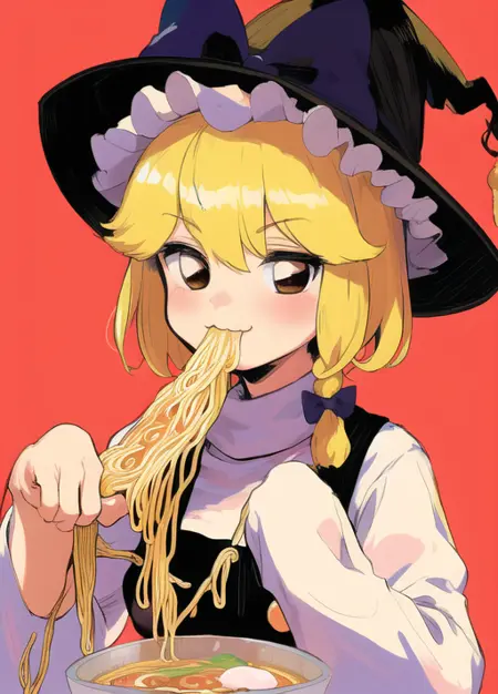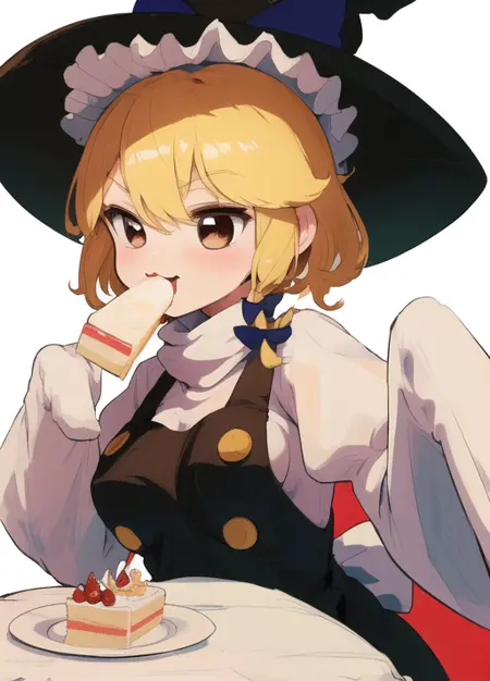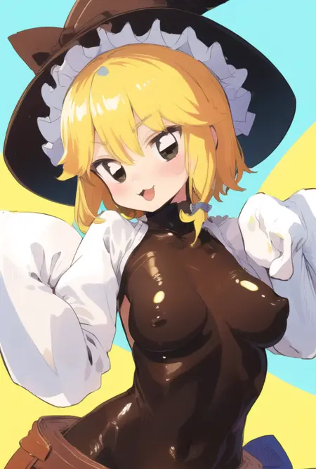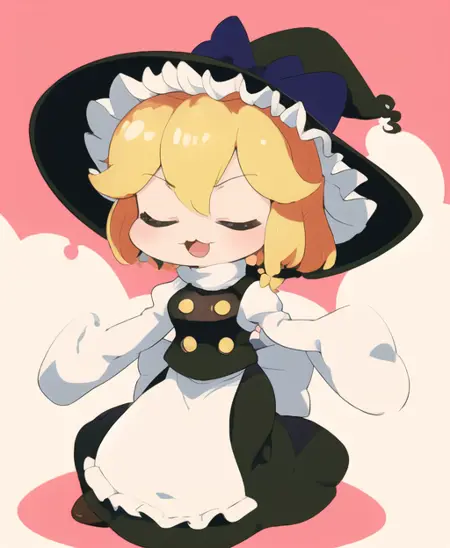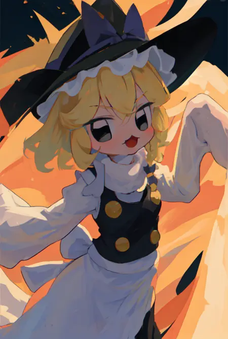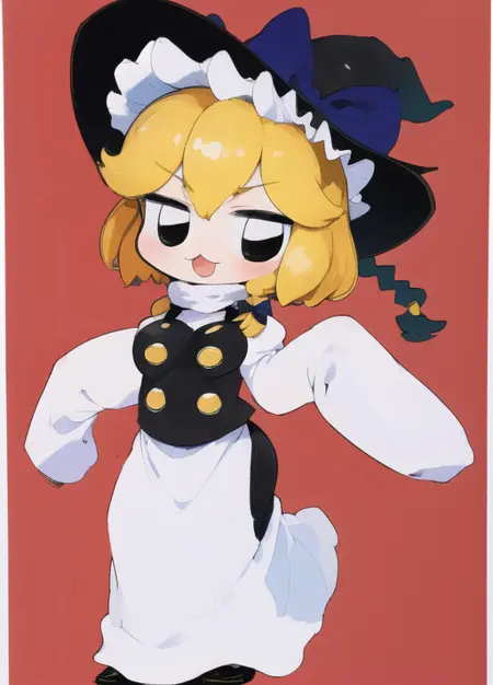 kirisame marisa, witch hat, hat bow, black vest, white sleeves, sleeves past fingers, long skirt, apron, blonde hair, short hair, black eyes, :3
