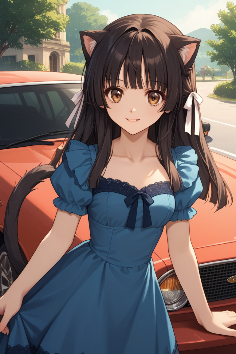 kobunyt, 1girl , cat ears, cat tail, long hair, black hair, brown eyes,