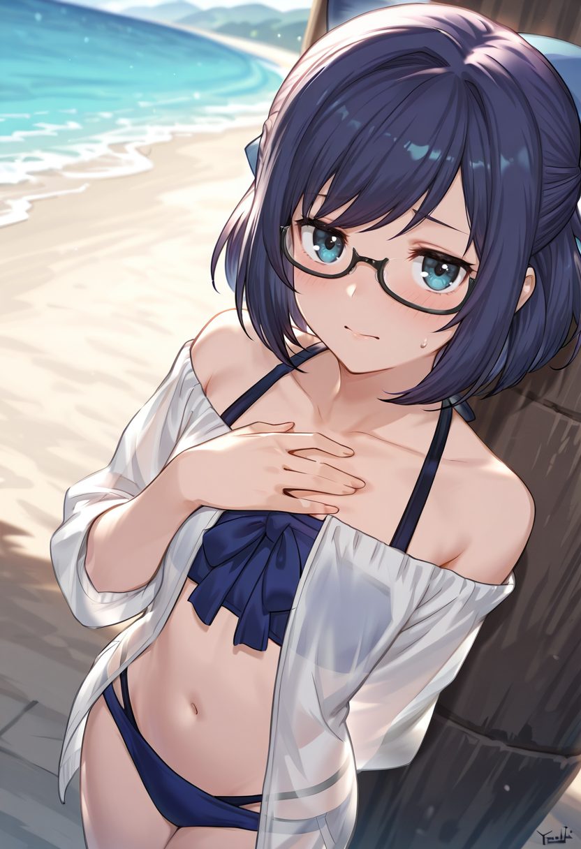 yuujin-a, offwork_a-chan, blue hair, short ponytail, low ponytail, parted bangs, single sidelock, blue eyes, under-rim eyewear, hairclip, black shorts, white sneakers, {track jacket, blue jacket | v-neck shirt, blue shirt, short sleeves, print shirt | track jacket, blue jacket, open jacket, v-neck shirt, blue shirt, print shirt}