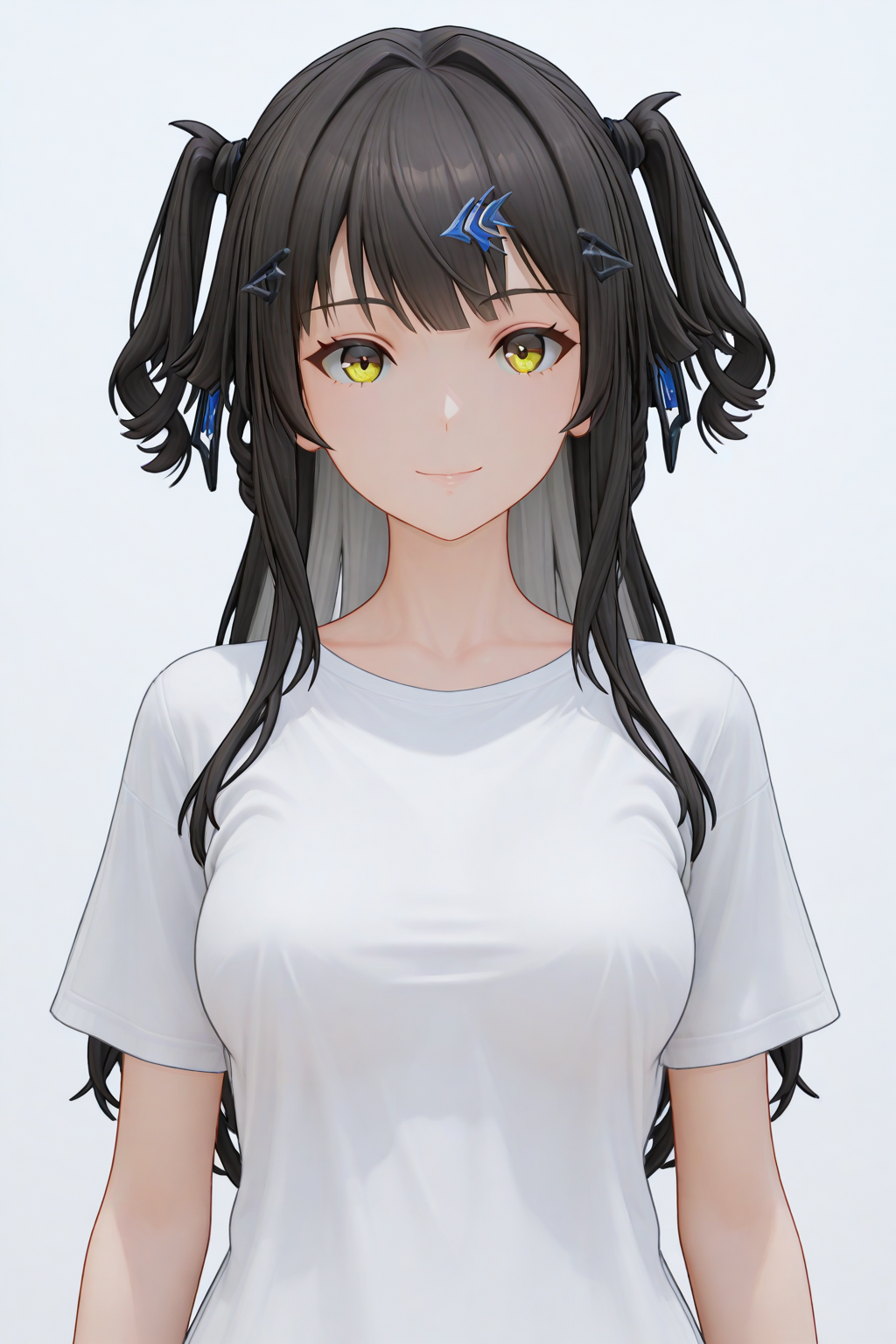 1girl, solo, adult, medium breasts, black hair, grey inner hair, two side-up, yellow eyes, hair ornament, bangs,