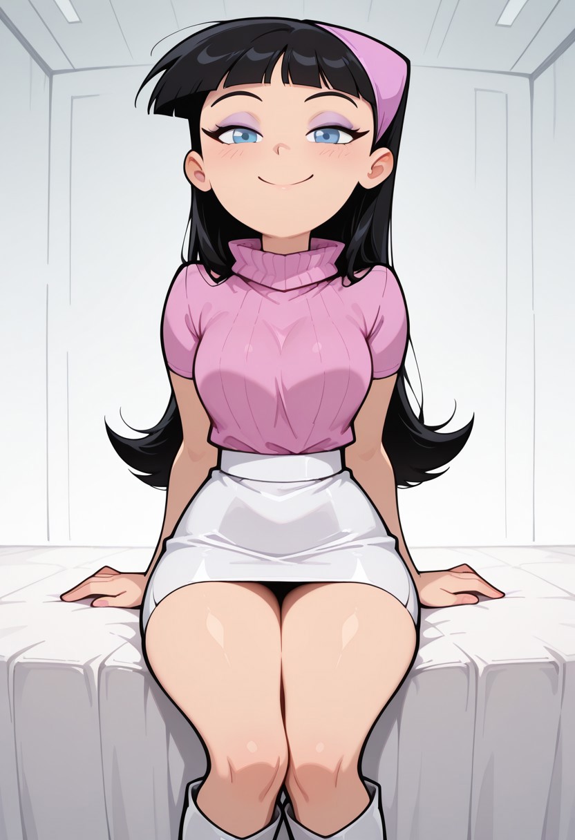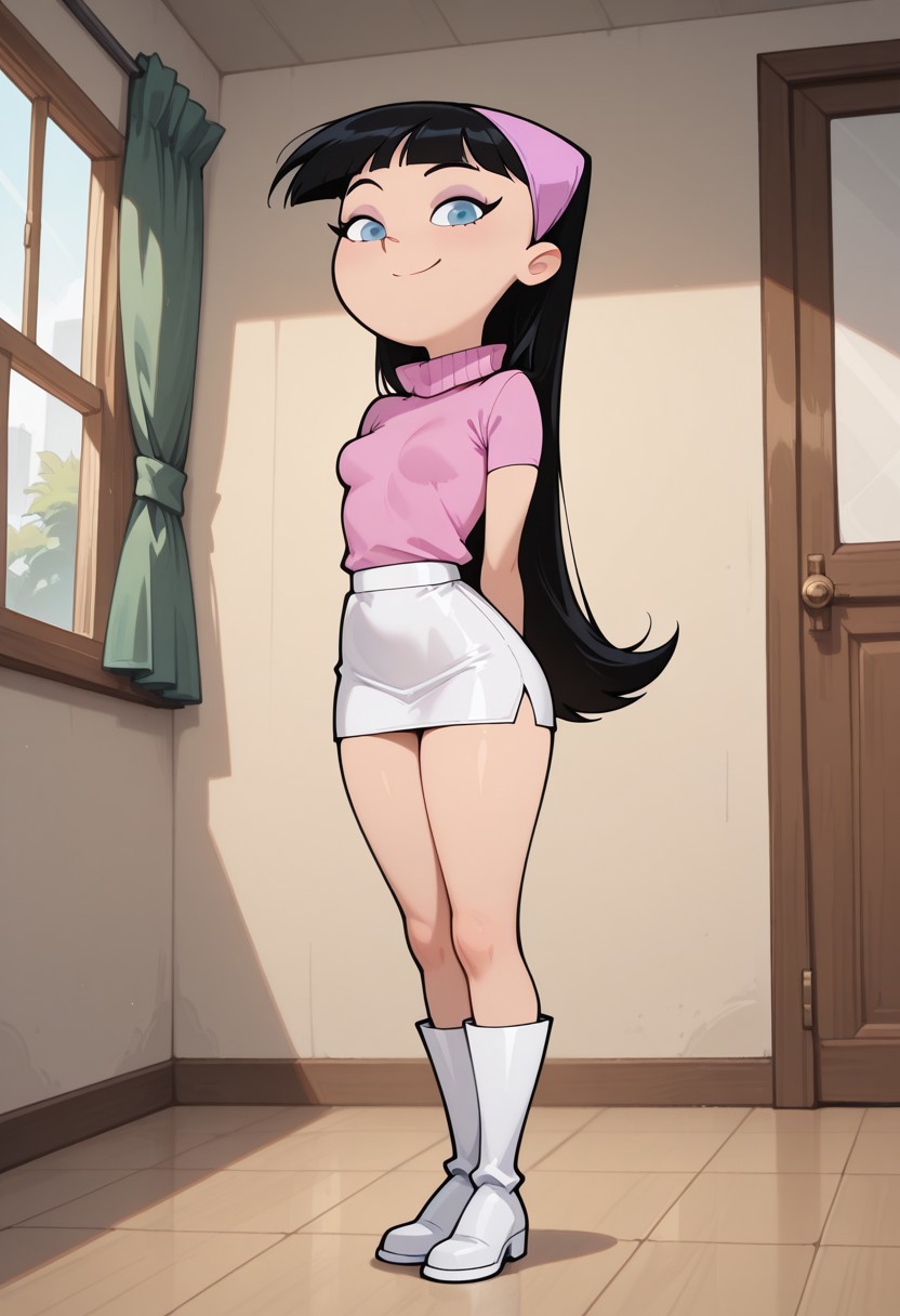 TRIXITANG, pink turtleneck, white skirt, white boots, blue eyes