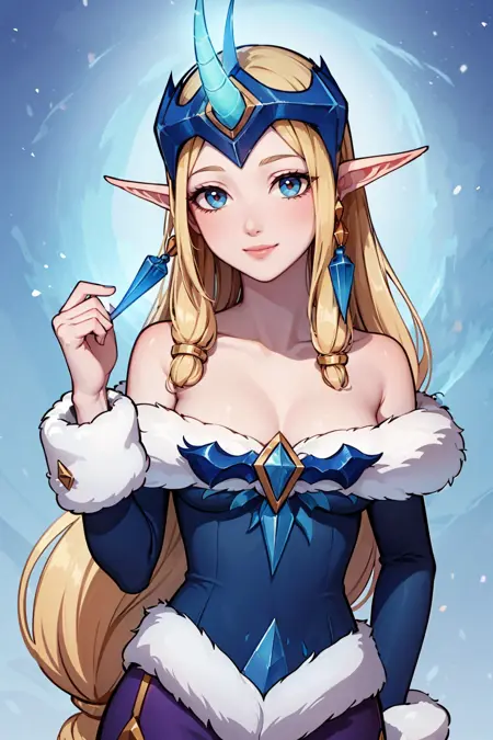 winter wonder soraka, 1girl, single horn, fur-trimmed dress, bare shoulders, earrings, blonde hair, pointy ears