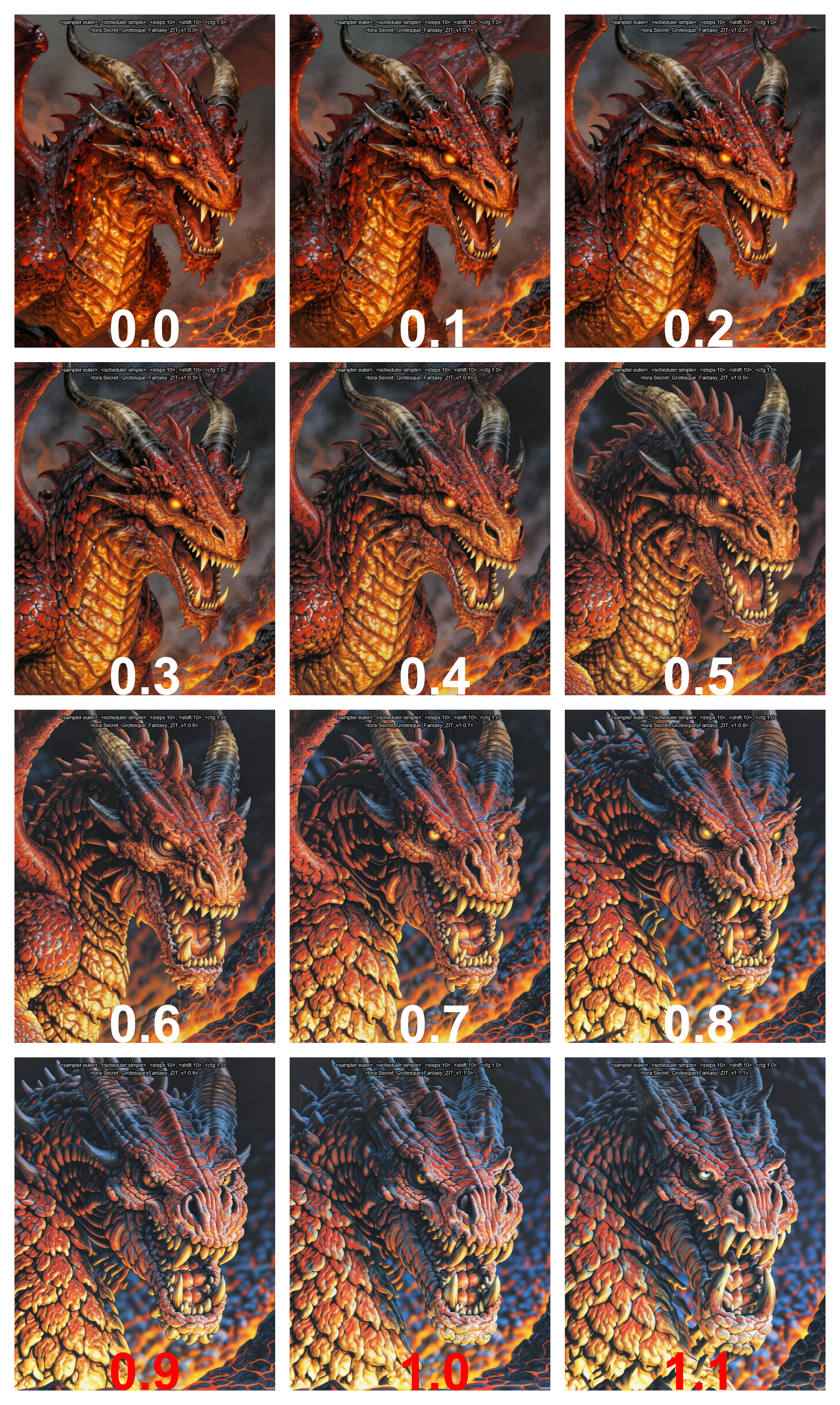 请使用轻量级 LoRA 权重! 我个人偏好将其设为 0.4 至 0.6。设为 0.8 可获得完全的怪诞奇幻风格与柔和色调,设为 0.2 则仅轻微点缀!不建议使用 1.0 的权重,但您可自由尝试。