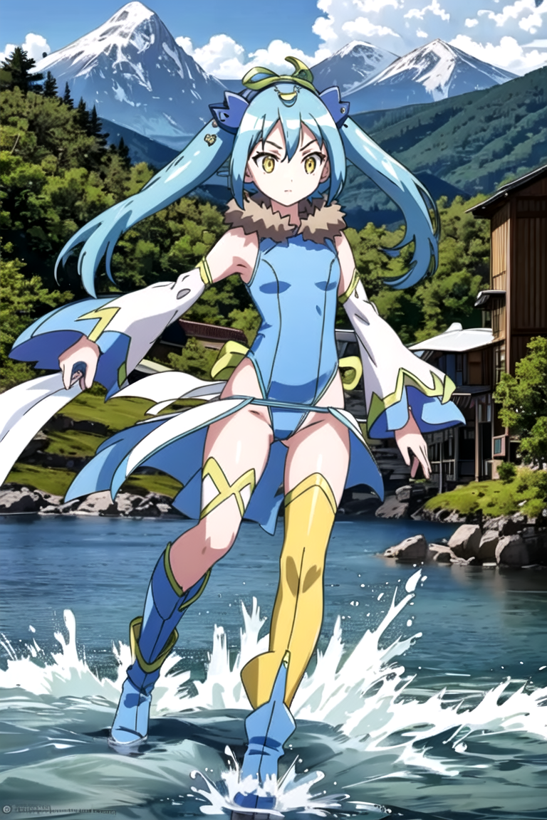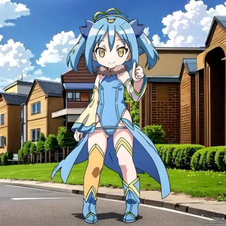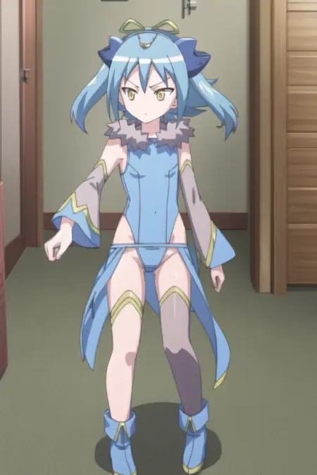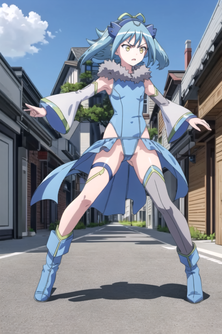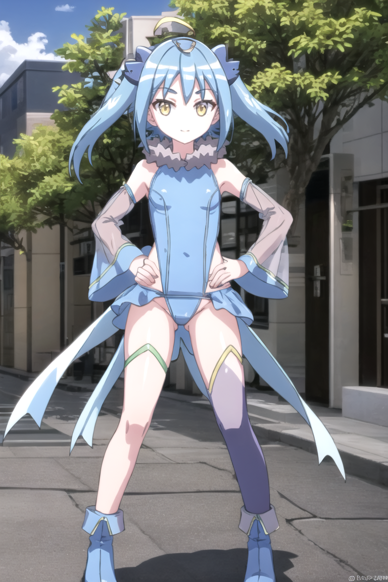 blue hair, yellow eyes, single thighhigh, detached sleeves, leotard, hair ribbon, asymmetrical legwear, twintails, boots, horizontal string around hips