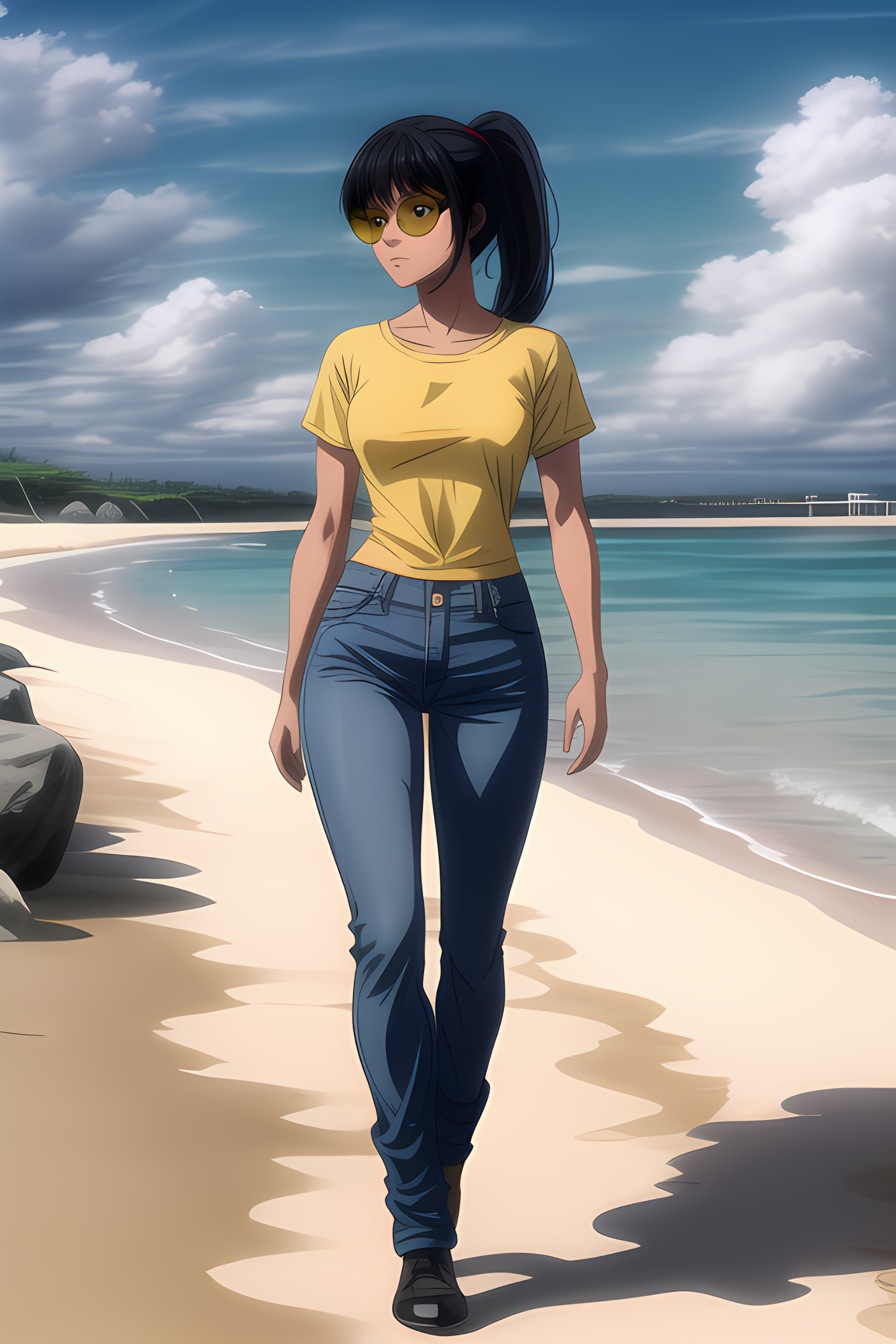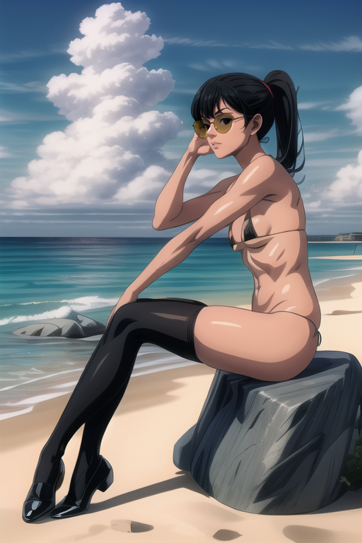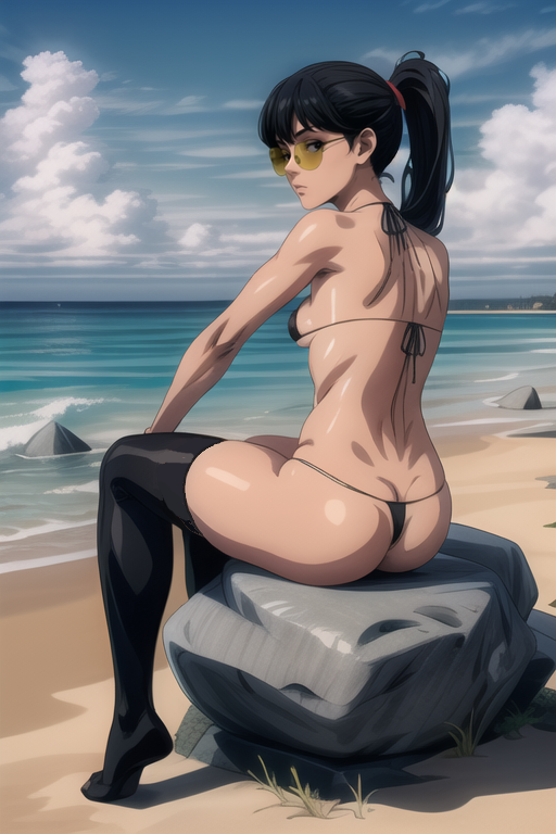 Basic prompt: sexybeachgal, tanned skin, medium breasts, yellow sunglasses, black eyes, black hair, bangs, ponytail, micro bikini, black thighhighs, slip on shoes