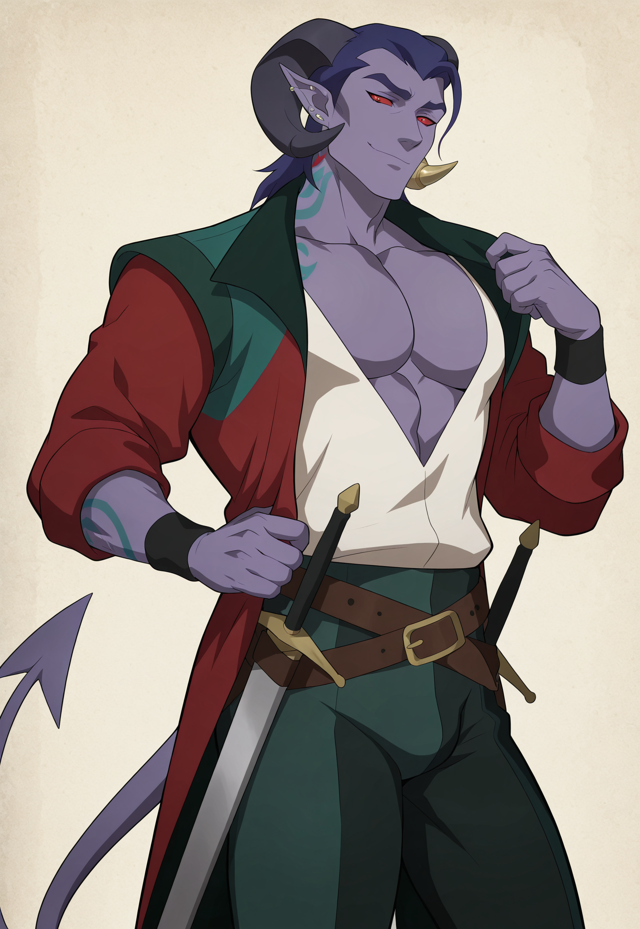 | 학습된 단어 | m0ll1, light purple skin, dark purple hair, medium hair, slicked back hair, front hair strand, red sclera, ligh red eyes, pointed ears, ear piercings, curved horns, dark horns, ornated horns, blue neck tattoo, blue forearm tattoo, light purple demon tail,복사됨! white shirt, deep v-neck shirt, long coat, asymmetrical coat, red coat, green teal accents, dark teal lapels, black wristband, leather belt, belt with straps, sword, sheath, sword at waist, green teal pants, stipped pants, black knee-high boots, pointy boots,복사됨! |