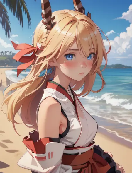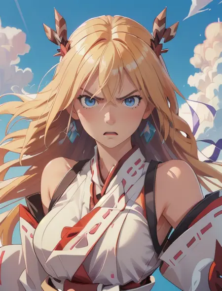 Additional words that may help: blue eyes, blonde hair, nontraditional miko