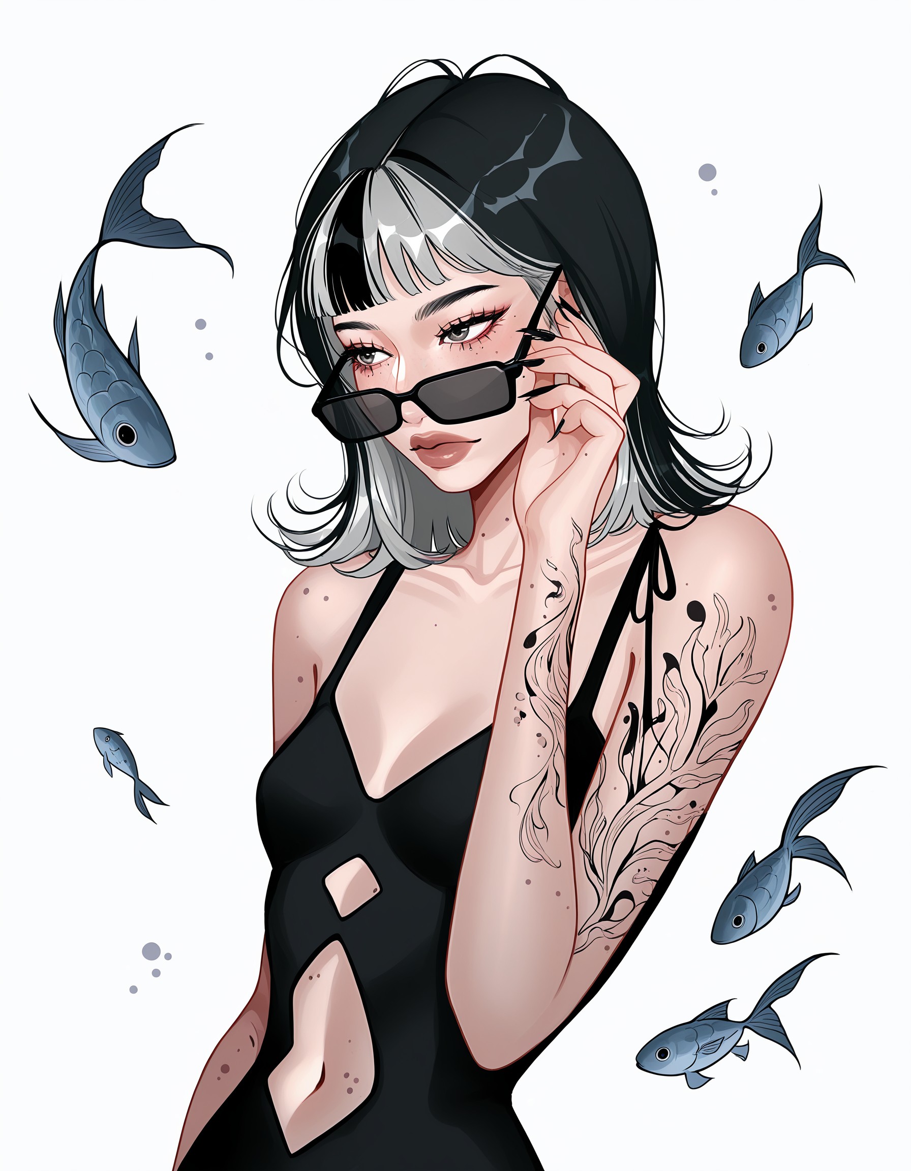 lips, red lips, multicolored hair, freckles, choker, collarbone, cleavage, nail polish, mole under eye, blunt bangs, ring, k-pop, grey hair, dress, portrait