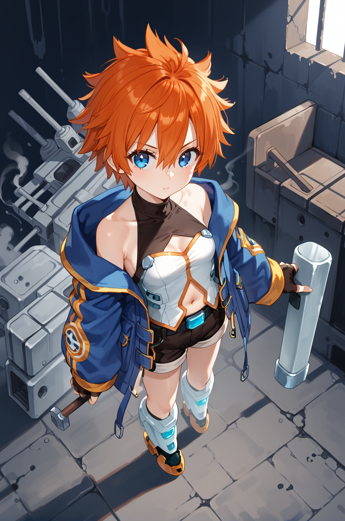 prompt: meistRO, halterneck, bare shoulders, sleeveless shirt, clothing cutout, open blue jacket, fingerless gloves, short black shorts, navel cutout, belt, socks, armored boots