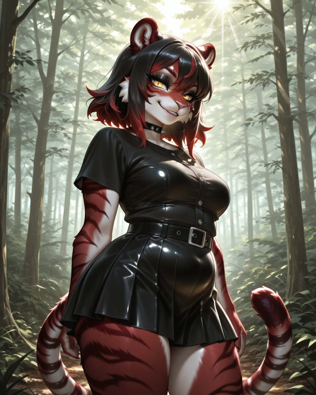 dark_red_fur, anthropomorphic female dark_red tiger,, (white countershading : 1.1), red highlights in hair,, yellow eyes,, white snout,, long eyelashes, black eyeshadow, feminine,, medium hair, dark hair,