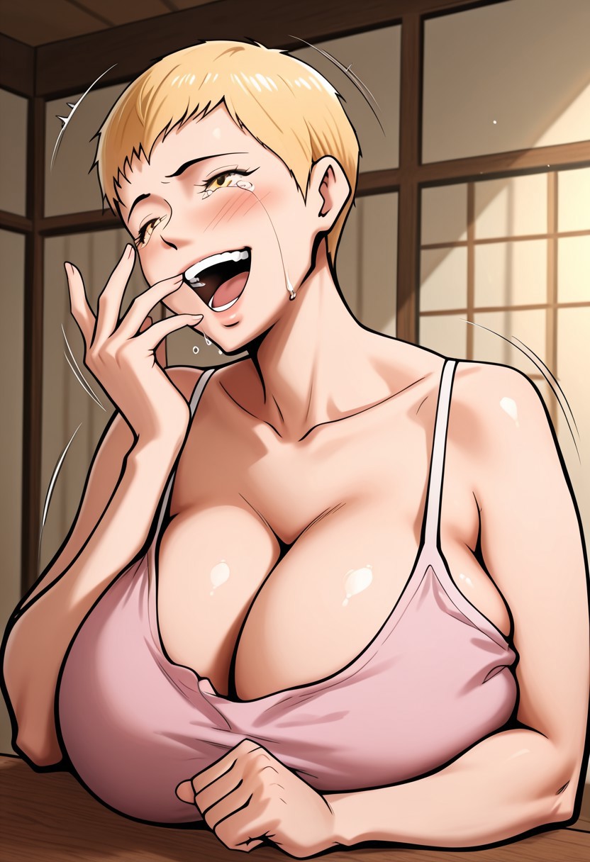 (( lora:s5pm3m:1 , s5pm3m, 美丽的黄色眼睛,清澈的眼眸,明亮的瞳孔,美丽的金色头发,美丽的短发剃发,凌乱的短刘海,非常巨大的乳房,皮肤凹陷,挺拔的乳房,纤细腰肢,宽臀,美丽的肌肤,自然美,超凡美丽的女性,有吸引力的女性,超级性感的女性,欲望的身体,充满诱惑与淫秽体态的性感女性,性感体态,瘦削身材,性感美,情欲熟女,))