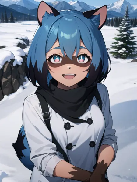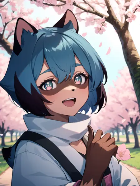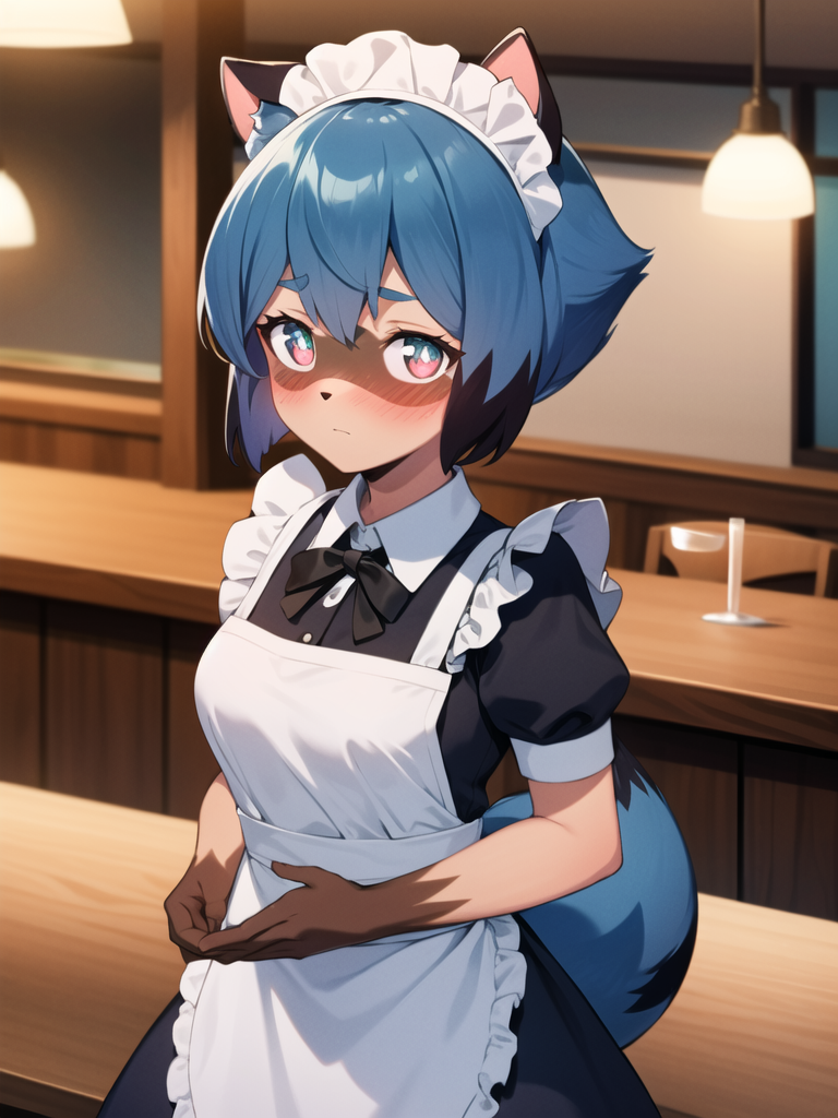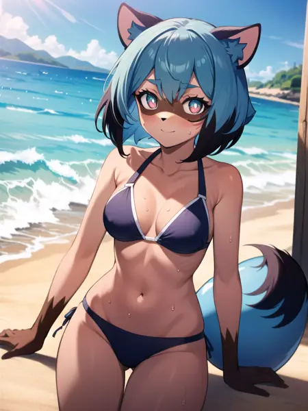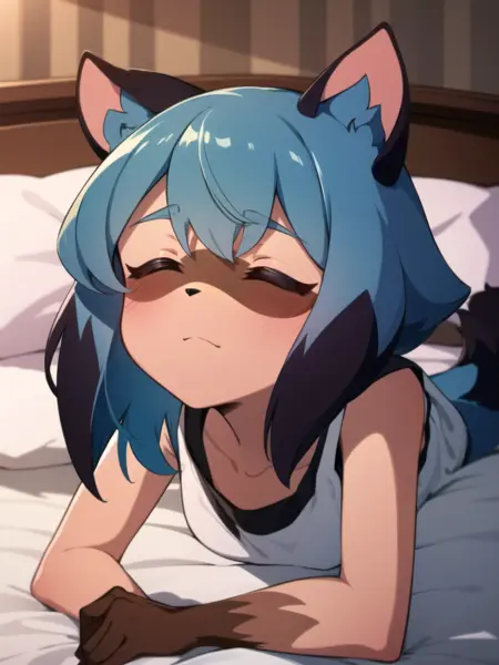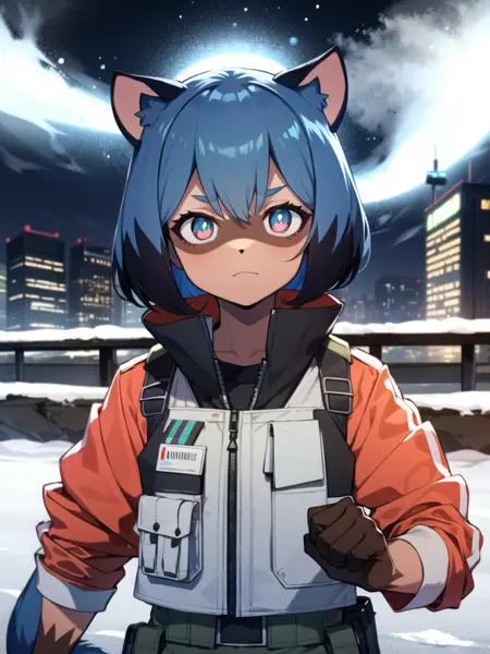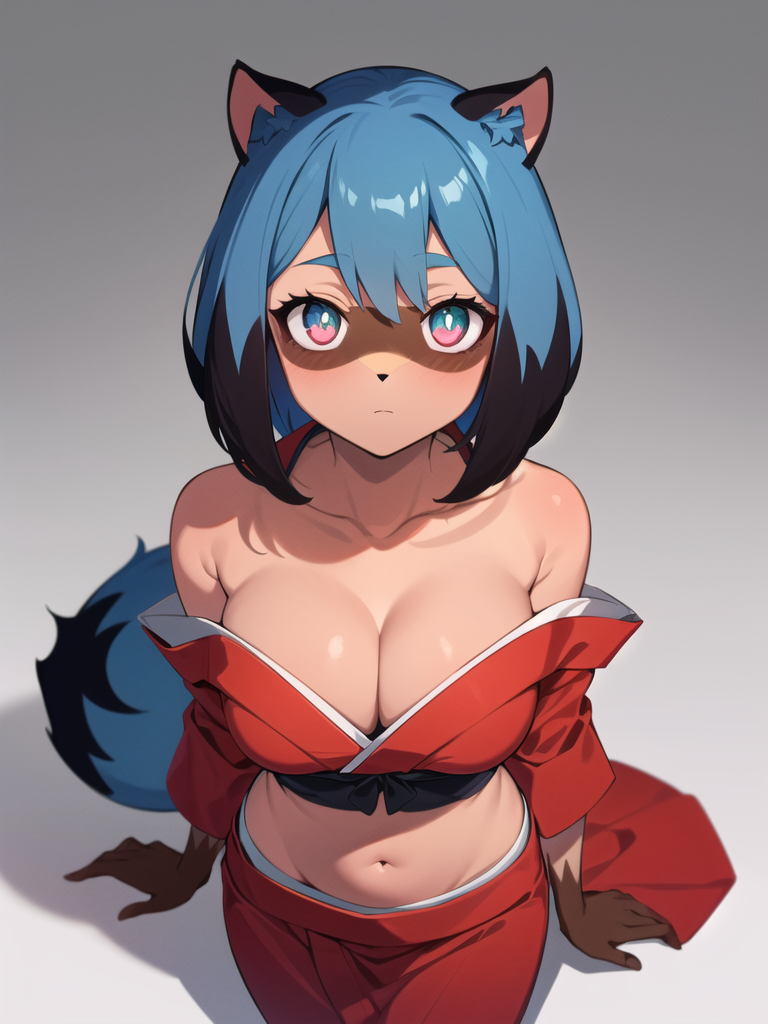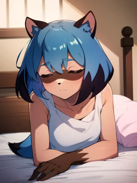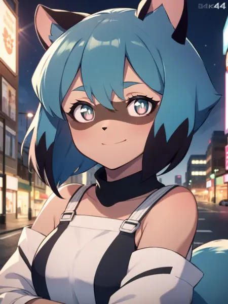 1 girl, raccoon girl, solo, furry, furry female, michiru_kagemori, blue hair, short hair, multicolored eyes, animal nose, triangle shaped nose, animal ears, (tail), [bushy tail], two tone skin, brown colored hands,