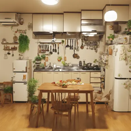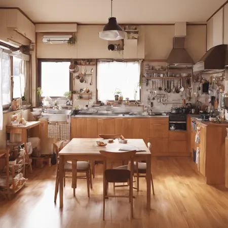 이 LoRA는 일본의 약간 오래된 단지나 아파트, 맨션 등 공동주택의 주방 같은 이미지를 생성할 수 있을 것입니다. 약간 좁은 느낌의 DK지만, 물건으로 가득 찬 풍부함과 생활감, 어수선함이 묻어납니다. 100엔숍 상품이나 아이디어 제품을 잘 활용해 정리하고 수납한 듯한 풍경이 그려집니다.昭和에서 평성 시대의 분위기와 향수를 느끼게 될 것입니다.