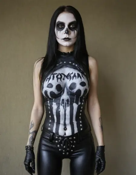 第二个模型可以生成带铆钉的皮夹克。你也可以创建带有文字的乐队徽章,但效果不如乐队T恤模型。触发词为 'heavy_jacket'。