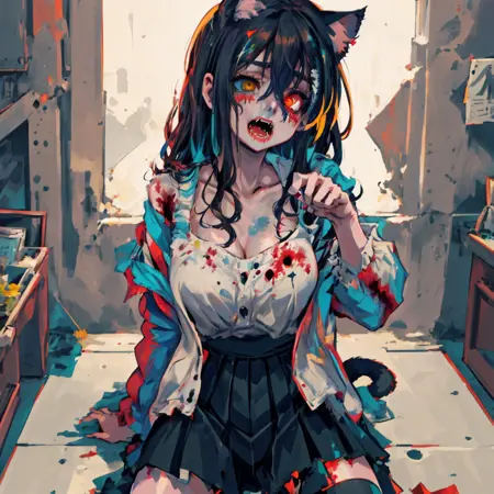 这是一个适合2D丧尸角色的LoRA,2.5D好像也不错,3D可能不太行。一般的2D大模型都还行推荐使用示例图片中的大模型。