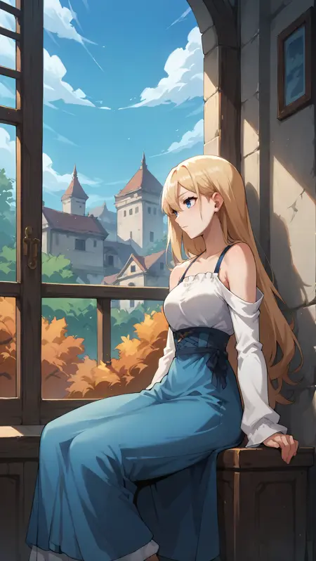 金髪、長い髪、白いシャツ、長袖、ロングドレス、青いドレス、青い目、肩出し
