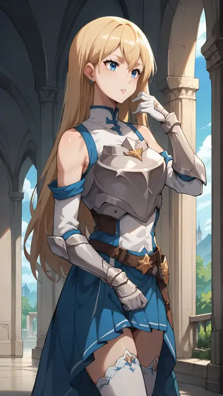 長い髪、金髪、青い目、青と白の鎧、胸当て、青いミニスカート、肩出し、外れ袖、白い手袋、白い太ももハイソックス