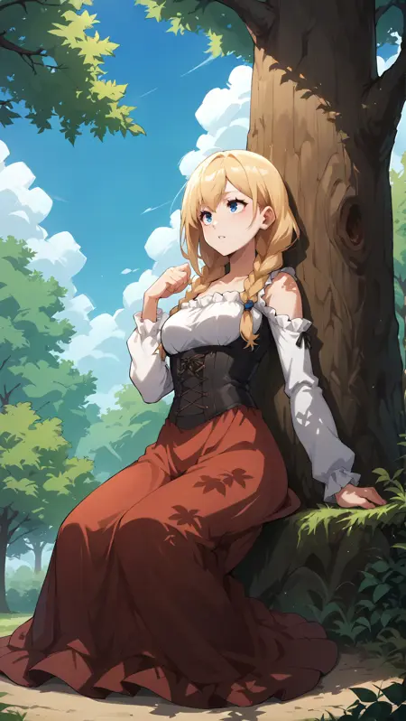金髪、ツインテール、青い目、白いフリルブラウス、黒いコルセット、ロングドレス、赤いドレス
