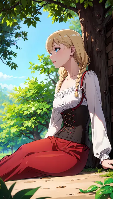 金发,双马尾,蓝眼睛,白色荷叶边衬衫,黑色紧身胸衣,长裙,红裙