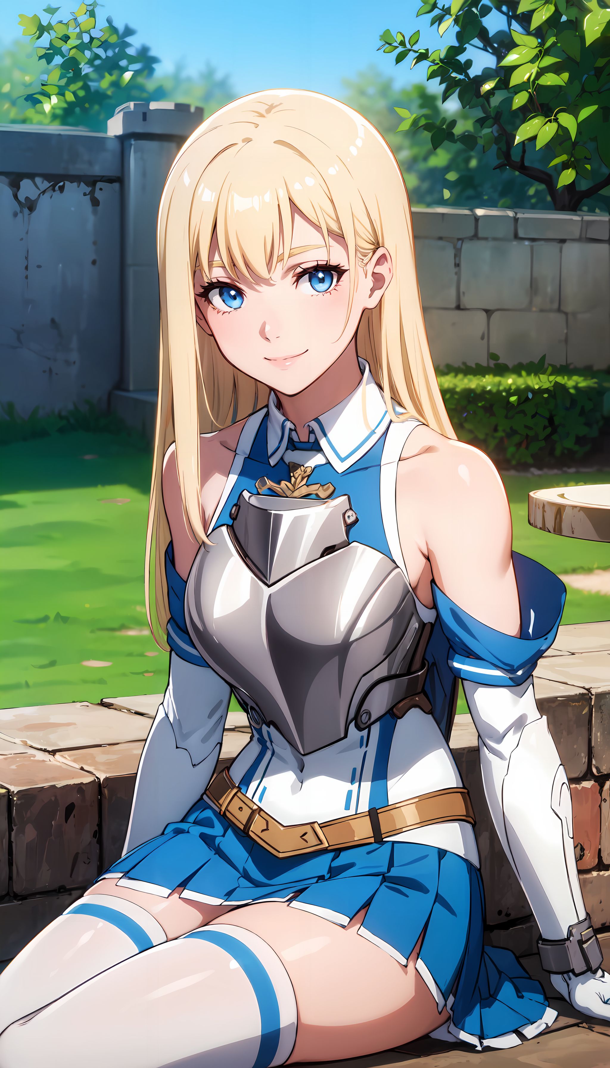 长发,金发,蓝眼睛,蓝白盔甲,胸甲,蓝色迷你裙,裸露肩膀,分离袖子,白色手套,白色过膝袜
