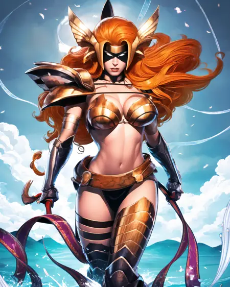 负面提示词:眉毛(因为模型会试图在面部盔甲上添加眉毛,导致效果奇怪)翅膀(有时会试图在她背上添加翅膀)