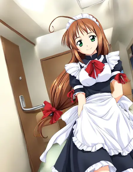 normal_nami, 1girl, 갈색 머리, 메이드, 녹색 눈, 긴 머리, 메이드 헤드기어, 가슴, 아호게, 빨간 리본, 프릴, 메이드 앞치마,