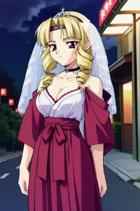 Sapphire, blonde hair, tiara, drill hair, long hair, red eyes, veil, choker, breasts,2000s \(style\),anime coloring,