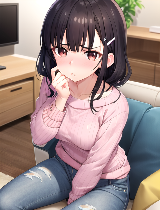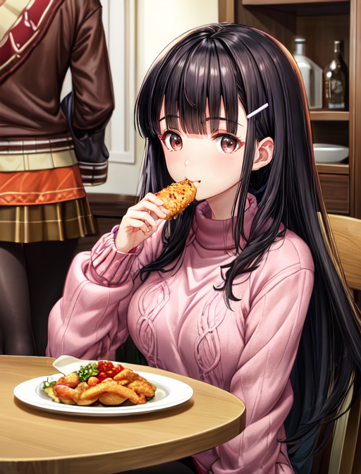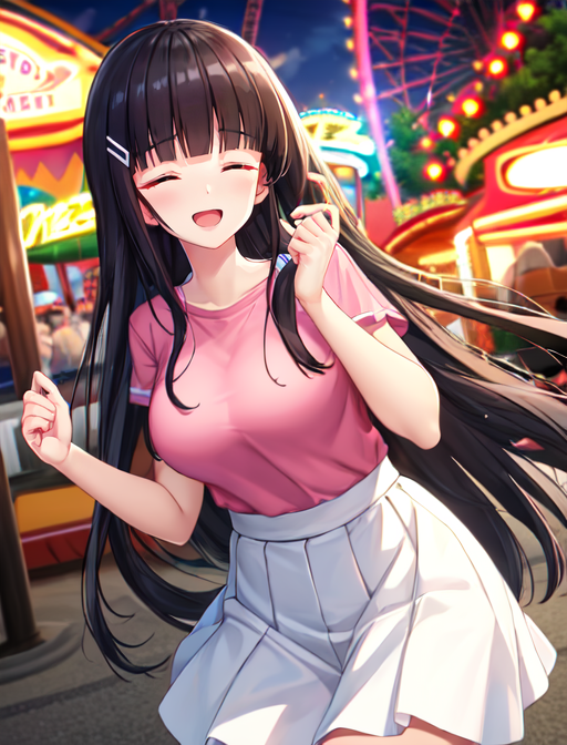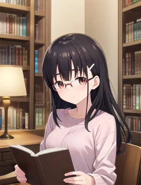 추가로 도움이 될 수 있는 단어: 검은 머리, 둔한 앞머리, 갈색 눈, 헤어 클립