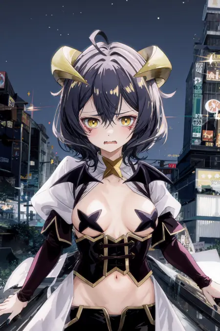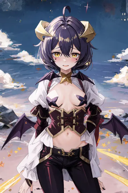 Use magiabaiser to summon her, use short hair, black hair, ahoge, bangs, hair between eyes, demon horns, yellow eyes, symbol-shaped pupils, wings, black nails to form her base apperance, use corset, long pants, lowleg pants, puffy sleeves, navel, star pasties to summon her outfit.