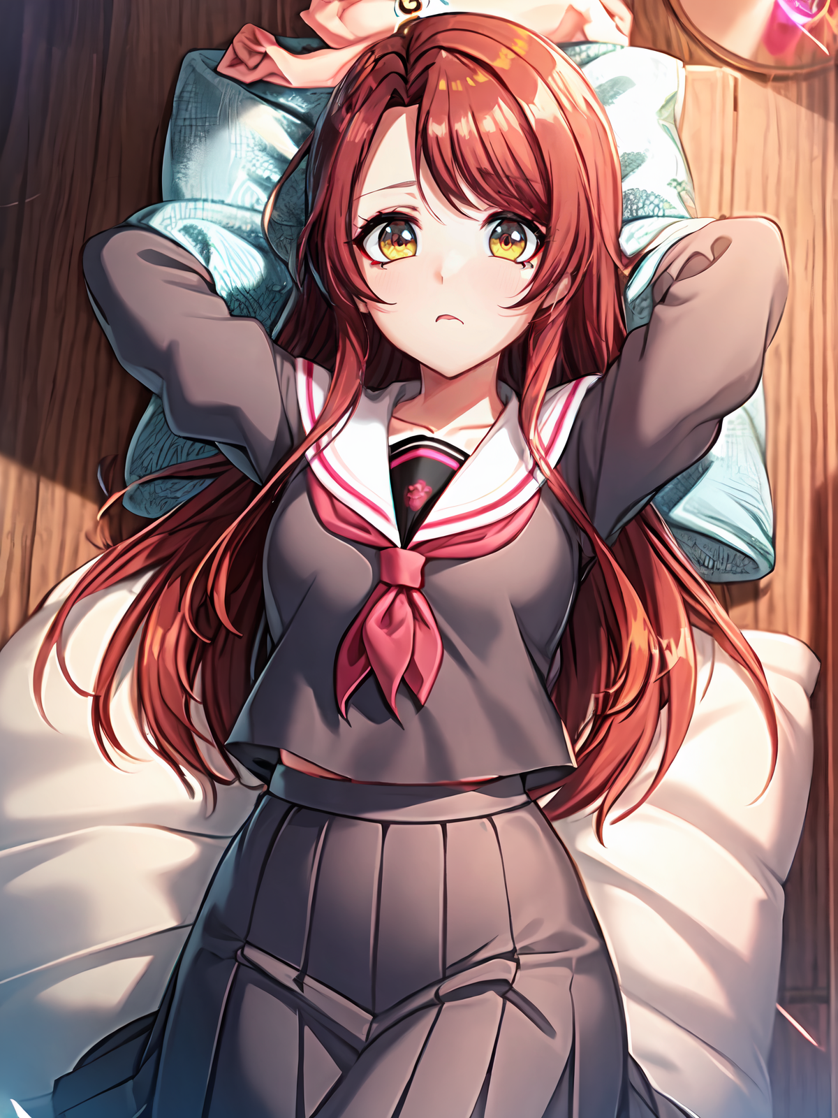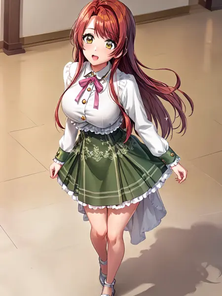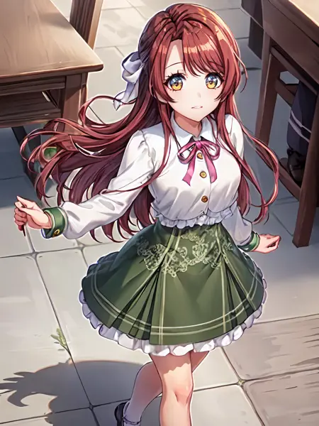서정적인 릴리 드레스: 긴 머리, 앞머리, 빨간 머리, 녹색 치마, 흰색 셔츠, 프릴, 노란 눈, 리본, 신발