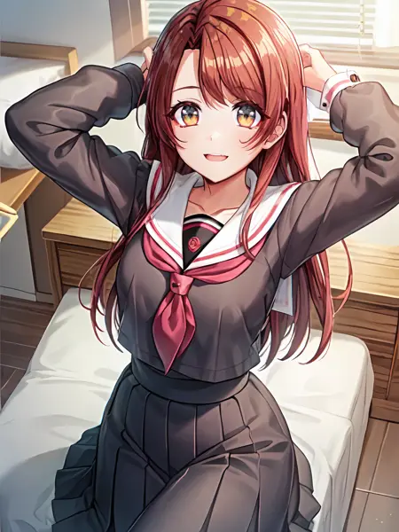 학교 유니폼: 리본, 신발, 뺨이 붉음, 미소, 평평한 가슴, 흰색 해군 칼라, 세라후쿠, 주름치마, 넥커처, 리본, 양말