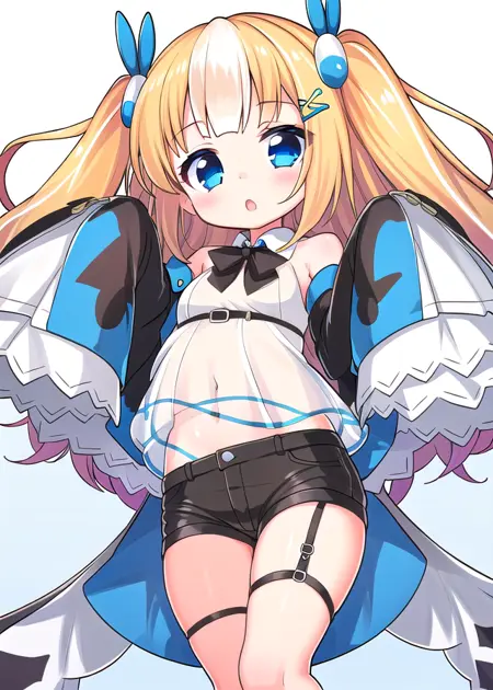 「金髪、長い髪、青い目、白髪、透け感、ショートパンツ、カーディガン、手首より長い袖、ボウタイ、髪飾り、太ももストラップ、ブーツ」