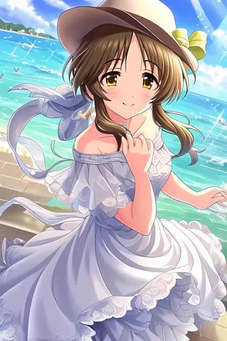 brown hair, 1girl, solo, brown eyes, long hair, smile, jewelry, looking at viewer, ponytail, breasts, necklace, hair ornament, white background, simple background, dress, open mouth, flower, medium breasts, blush, gloves