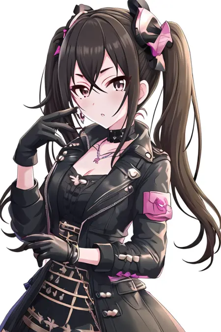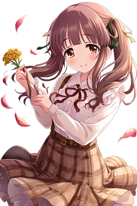 brown hair, 1girl, solo, brown eyes, long hair, smile, jewelry, looking at viewer, ponytail, breasts, necklace, hair ornament, white background, simple background, dress, open mouth, flower, medium breasts, blush, gloves