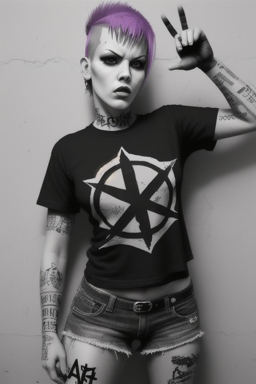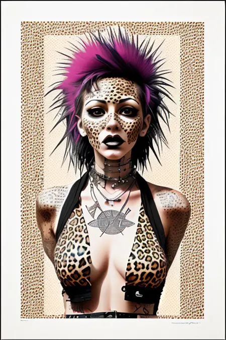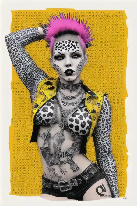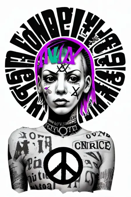 役立つプロンプトワード: so77スタイル、パンク、パンク女性、タイポグラフィー、ポップアート、コラージュ、裂けた、破れた、ミックスメディア、パンクスタイル、アセンブリ