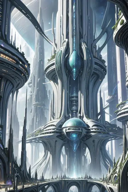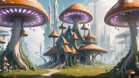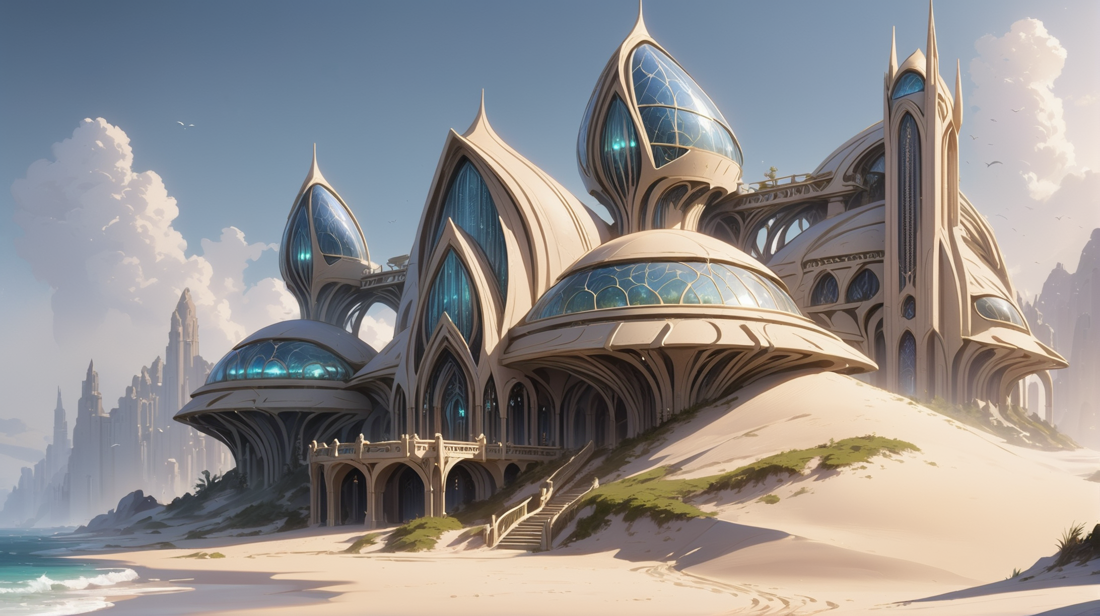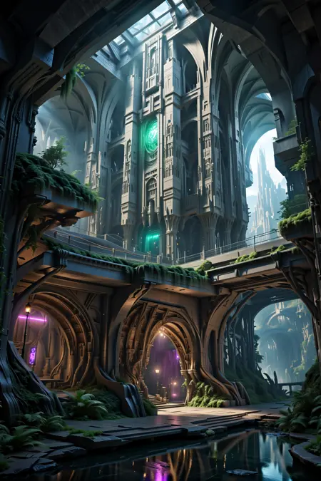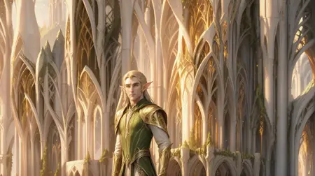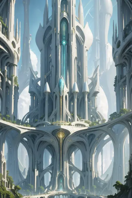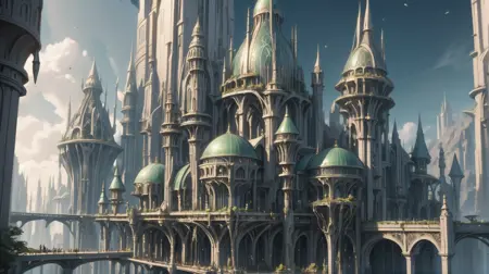 • 使用“elven architecture”作为触发词,并将强度设为1,以获得非常精灵风格的效果。