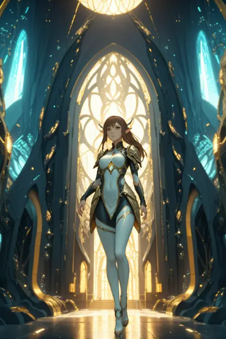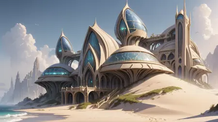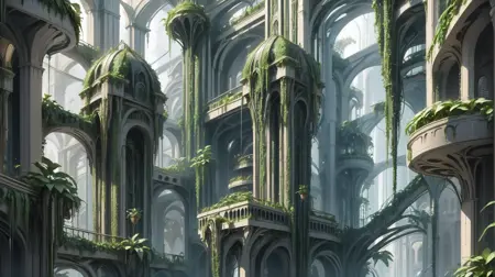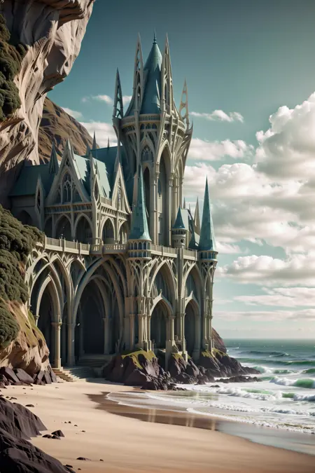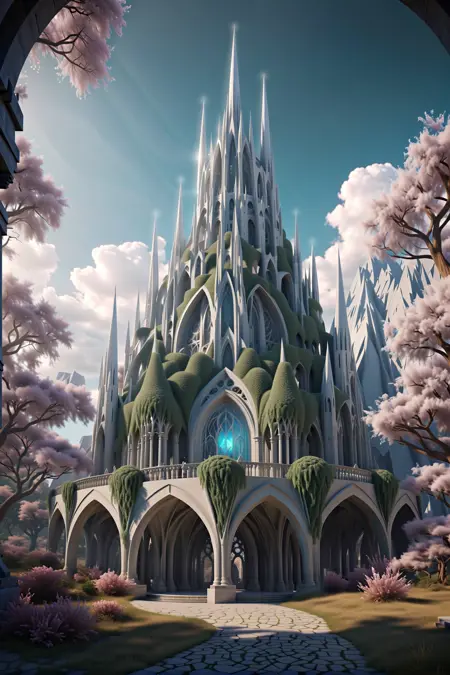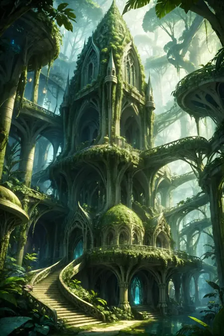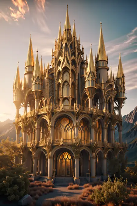 使用“elven architecture”作为触发词,并将强度设为1,以获得非常精灵风格的效果。