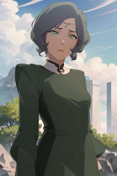 suyin, short hair, grey hair, (green eyes:1.5), dark skin, dark-skinned female,