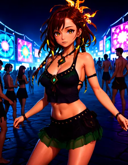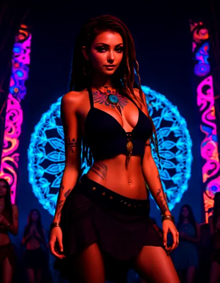 「ゴア」スタイルは、ボヘミアンで自由な美的感覚が特徴で、トランスやエレクトロニック・ダンス音楽のシーンに深く根ざしている。このファッションには、天然素材、非対称なデザイン、そして土着色とネオンカラーの組み合わせが含まれており、モデルの鮮やかな入れ墨や自然な流れのある衣装に見られる。