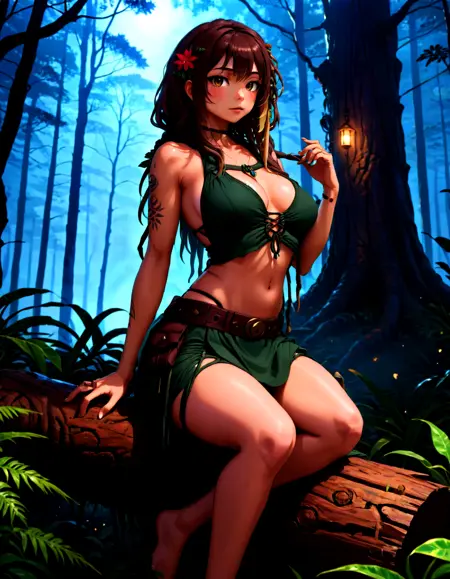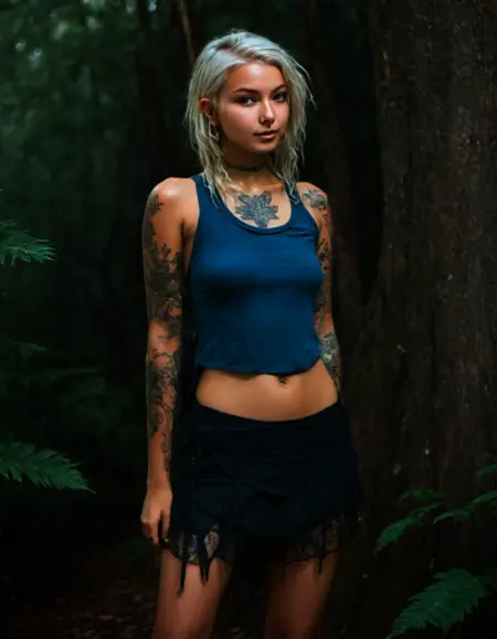 モデルの衣装は、ファンタジーとタブリーな影響が融合したもので、上下ともにぼろぼろで土着的な外観を持ち、自然とのつながりと自由なライフスタイルを示唆している。ボディアートやジュエリーの使用は、自己表現と従来のファッションの規範からの脱却を謳うゴアスタイルの神秘的な側面をさらに強調している。