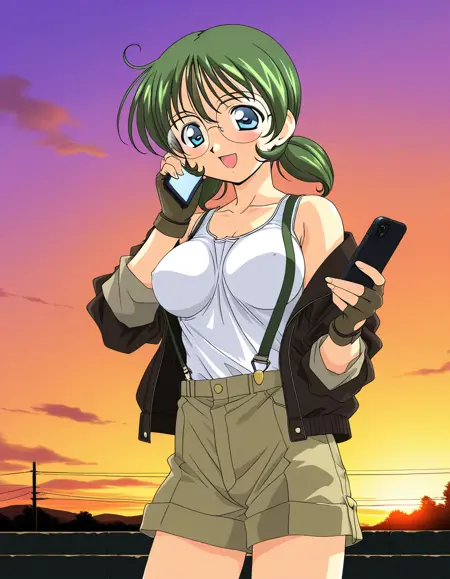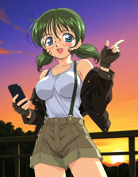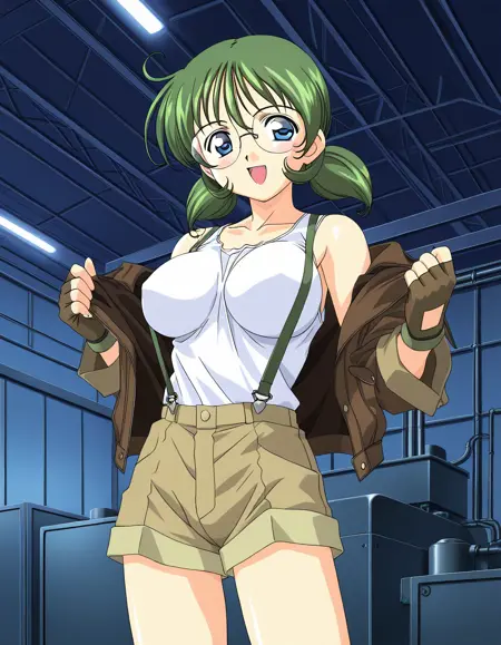 Sakurako, solo, glasses, green hair, blue eyes, twintails, short hair, large breasts,2000s \(style\),anime coloring,