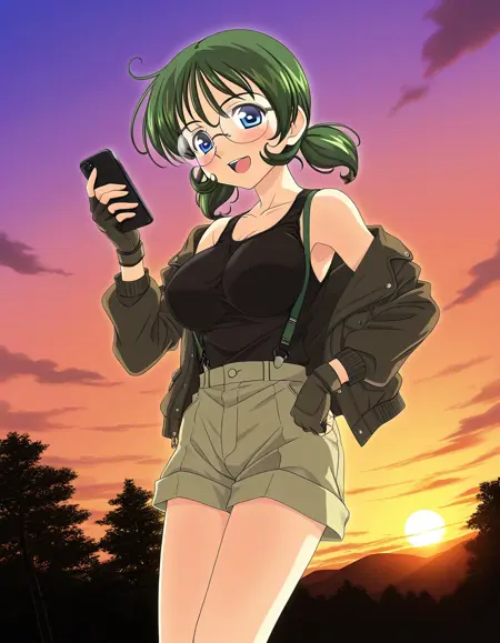 Sakurako, solo, glasses, green hair, blue eyes, twintails, short hair, large breasts,2000s \(style\),anime coloring,