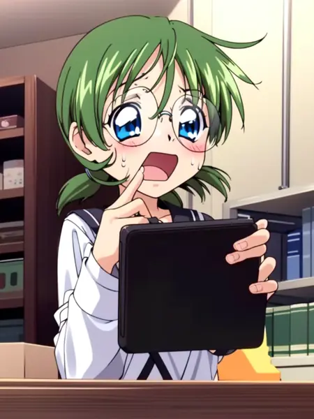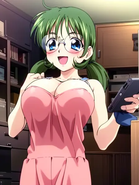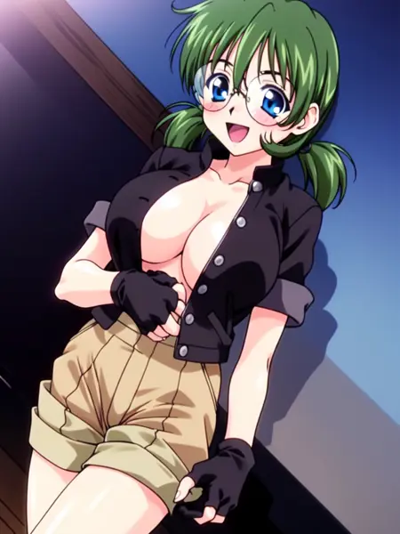 Sakurako, solo, glasses, green hair, blue eyes, twintails, short hair, large breasts,2000s \(style\),anime coloring,