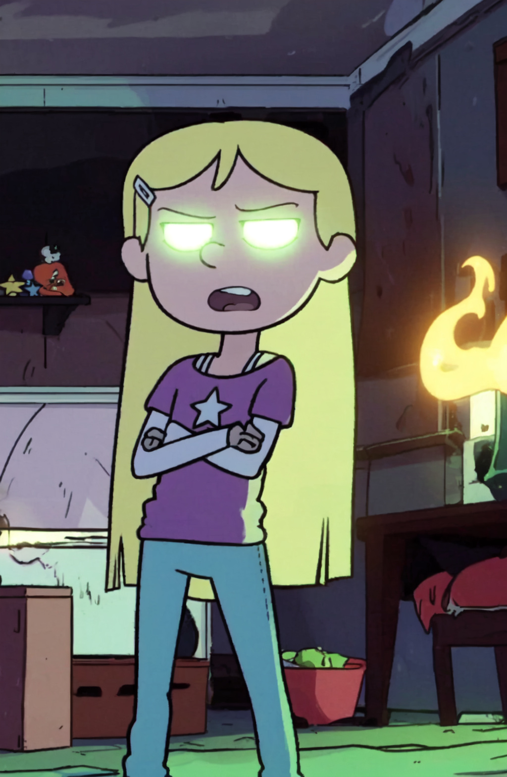 Kelly Marra, long hair, blonde hair, shirt, black eyes, hair ornament, long sleeves, hairclip, pants, off shoulder, star (symbol), hand on hip, t-shirt, star print