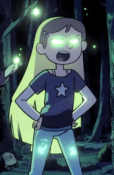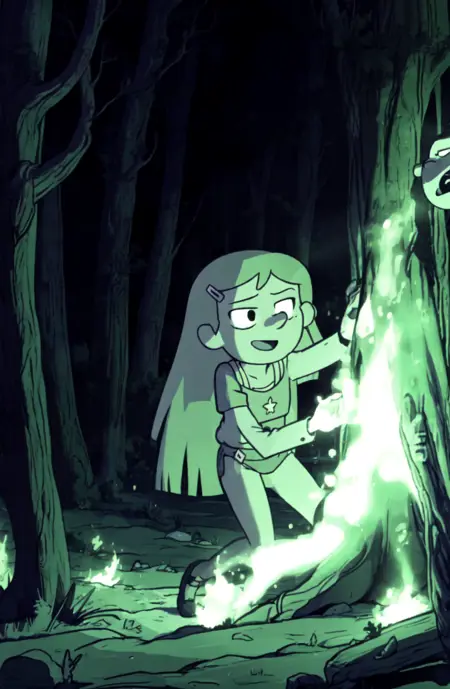 tree, glowing, t-shirt, glowing eyes, star print, dark forest, night