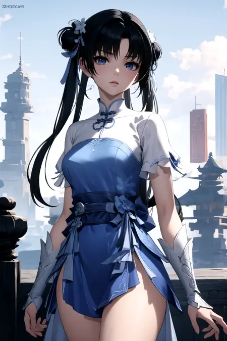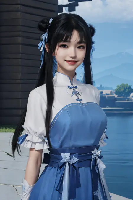 推荐提示词:zhaolinger,blue and white dress,hair bun,bangs,twintails,black hair,