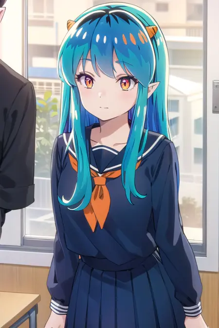 lum, 긴 머리, 앞머리, 파란 머리, (주황색 눈:1.5), 뿔, 뾰족한 귀, 청록색 머리, 옴니 뿔, 아이섀도우,