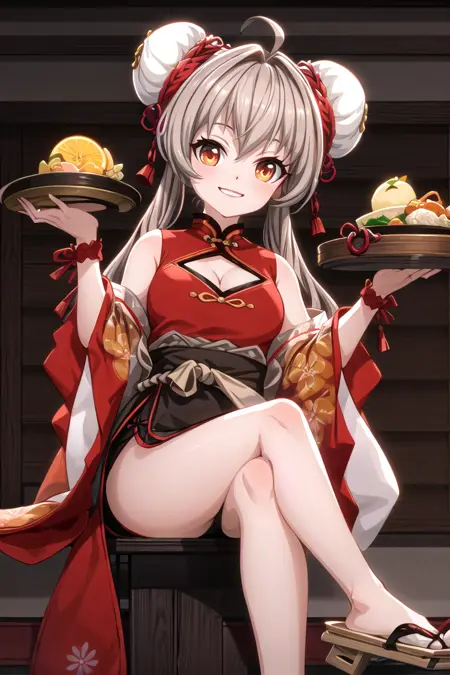 Suggested prompt: 1girl, ahoge, bangs, blonde hair, brown hair, twintails, white hair, double bun, grey hair, long hair, red hair bun, hair flower, hair ornament, red bun cover, orange eyes, china dress, chinese clothes, cleavage cutout, clothing cutout, detached sleeves, japanese clothes, jewelry, long sleeves, red dress, geta, shorts, skirt, sleeveless, wide sleeves, black shorts, wrist cuffs, bare legs, holding food, holding tray