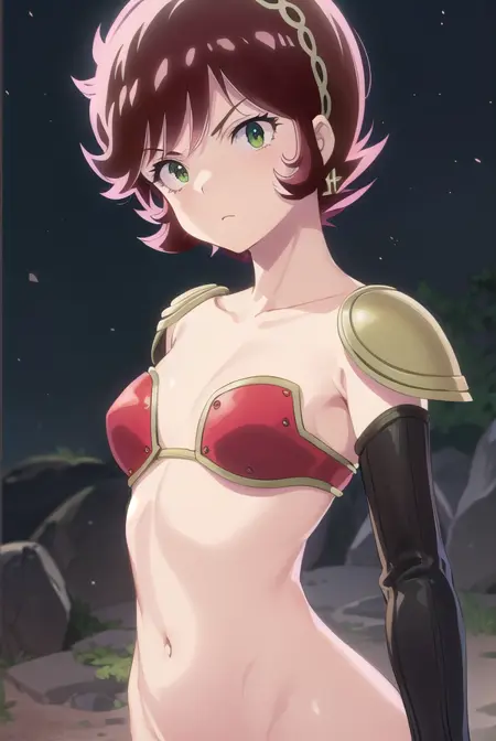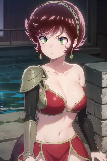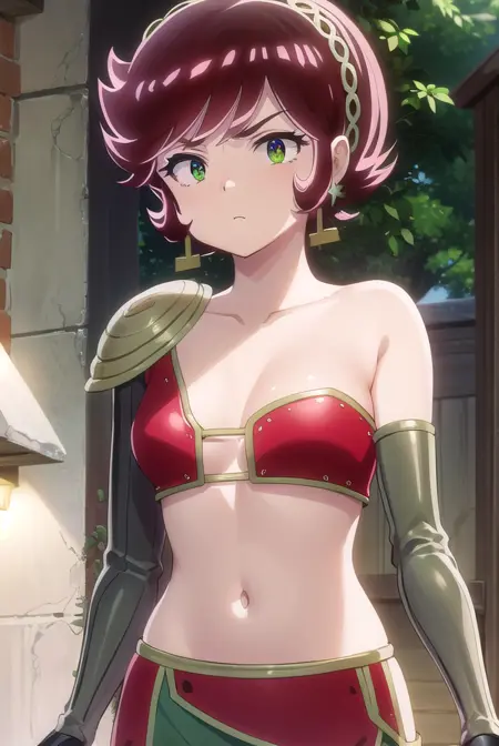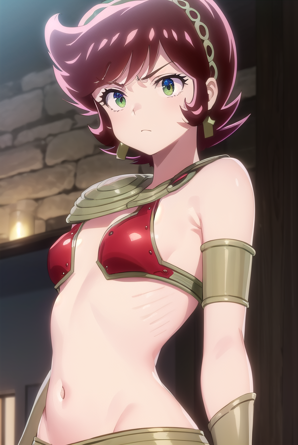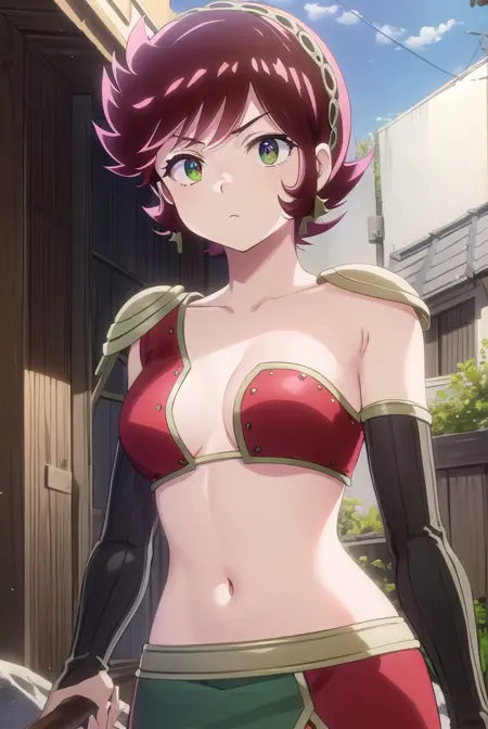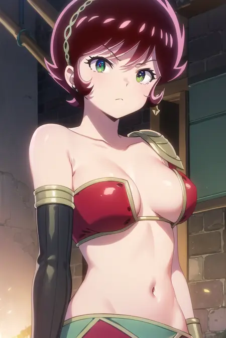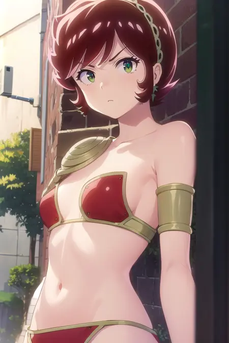 benten, short hair, (green eyes:1.5), red hair, hairband,
